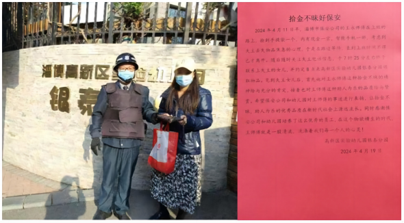 4月11日,市保安公司高新區銀泰城幼兒園項目部保安隊員王永上班路上撿到手提袋一個,四處找尋無果后,打開查看包內有手機和少量現金,通過電話聯系找到失主,最終歸還遺失物品。失主家人拿到失而復得的財物后,十分激動并專門送上感謝信對其表示感謝。