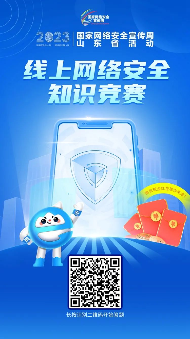 為面向廣大網民普及網絡安全知識引導網民樹立正確網絡安全觀念,提升網民防護意識,2023國家網絡安全宣傳周山東省活動,線上網絡安全知識競賽即將上線,輕松答題贏紅包,答題活動時間為9月10日—17日,微信掃描下方二維碼即可進入參與。